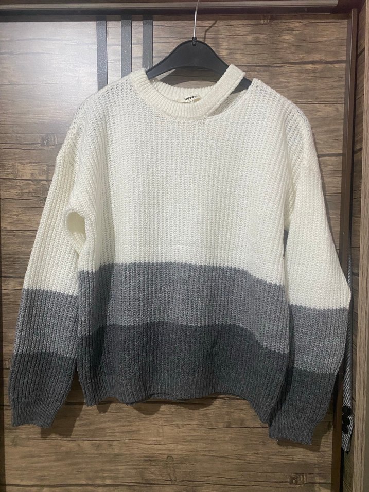 Örgü kumaştan, bisiklet yaka ve uzun kollu, bol kesim gri tonlarında kadın triko kazak. Günlük sokak stiline uygun midi uzunlukta.