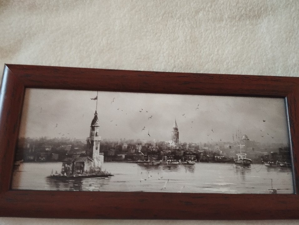 Ahşap çerçeveli, gri tonlarda İstanbul manzarası ve deniz kıyısında martılar gösteren koyu renkli tablo.