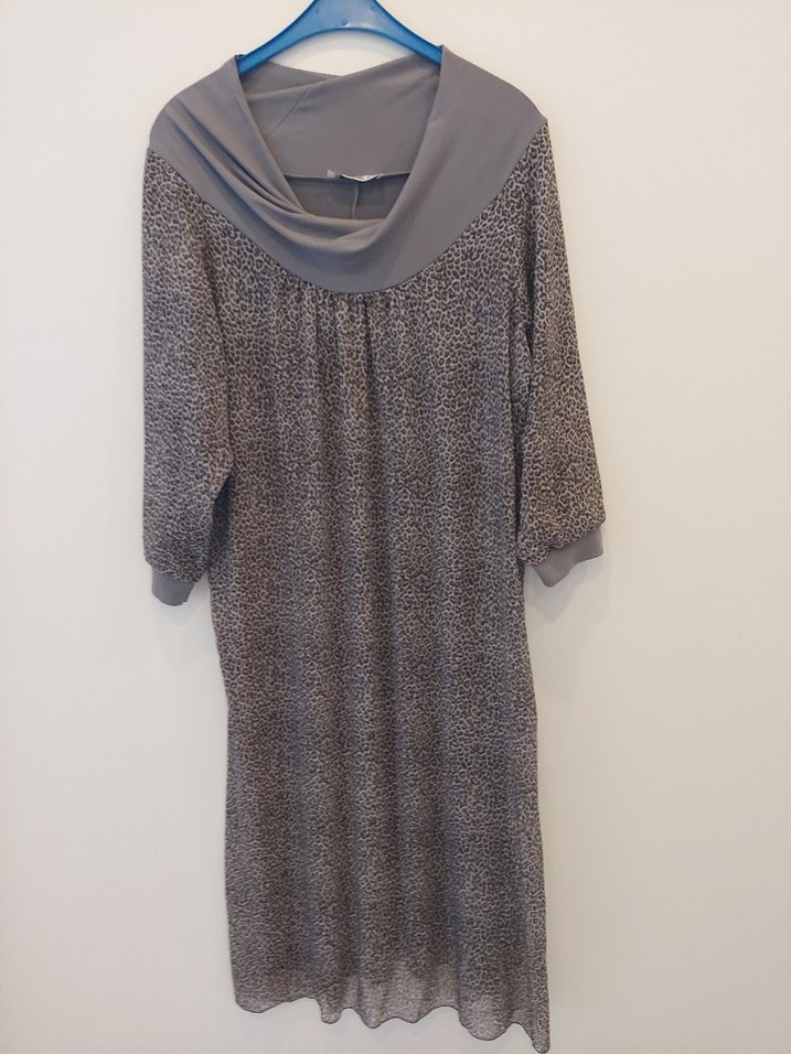 Tdee marka, buyuk 2 beden (46), siyah - gri leopar kombinli, bol, ustu sifon, ici gri jarse, kirismayan, tril tril, degaje yaka, tuvakar, yarasa kollu, yakasi ve manseti gri jarse elbise. Ölçüleri: boy 108, iki koltuk altı arasi 55, kol boyu 43 cm.