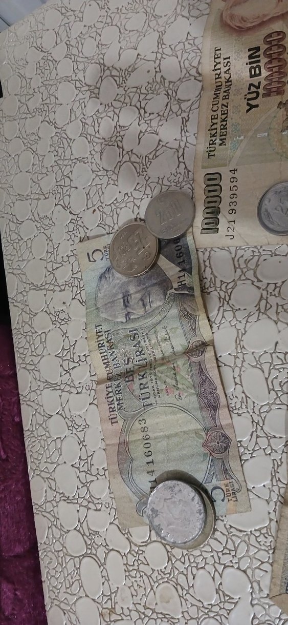 Gri tonlarında Türk lirası banknotu ve madeni paralar, dokulu bir yüzeyde sergilenmiştir. ve ayrıca 2 adet ptt jetonları da var satılıkdır elden teslim edilir
