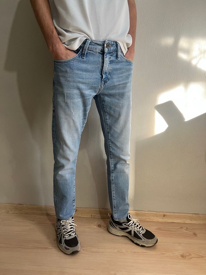 Gri tonlu mavi renk, regular fit kesim ve bağlama desenli denim pantolon, günlük rahat kullanıma uygun midi boy sokak stili.
