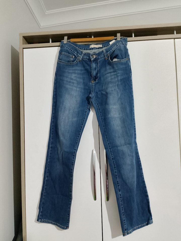Gri tonlu mavi renkte, bol kesim kadın kot pantolon, günlük rahat kullanım için uygundur. Pazarlık payı vardır.