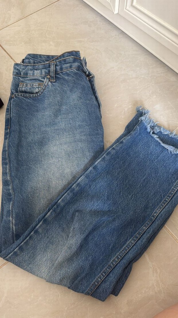 Bu mavi denim kot pantolonlar, salaş kesim ve midi boy ile günlük kullanıma uygun rahat bir sokak stili sunar. Kumaş hafifçe soluk gri tonlardadır, zahmetsiz şıklık sağlar.