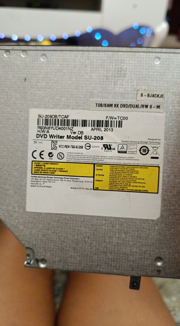 Gri renkte Toshiba SU-208 DVD yazıcı, çift katmanlı DVD yazma ve yeniden yazma özelliklerine sahiptir. Nisan 2013 modeldir. çalışıp çalışmadığı bilinmiyor