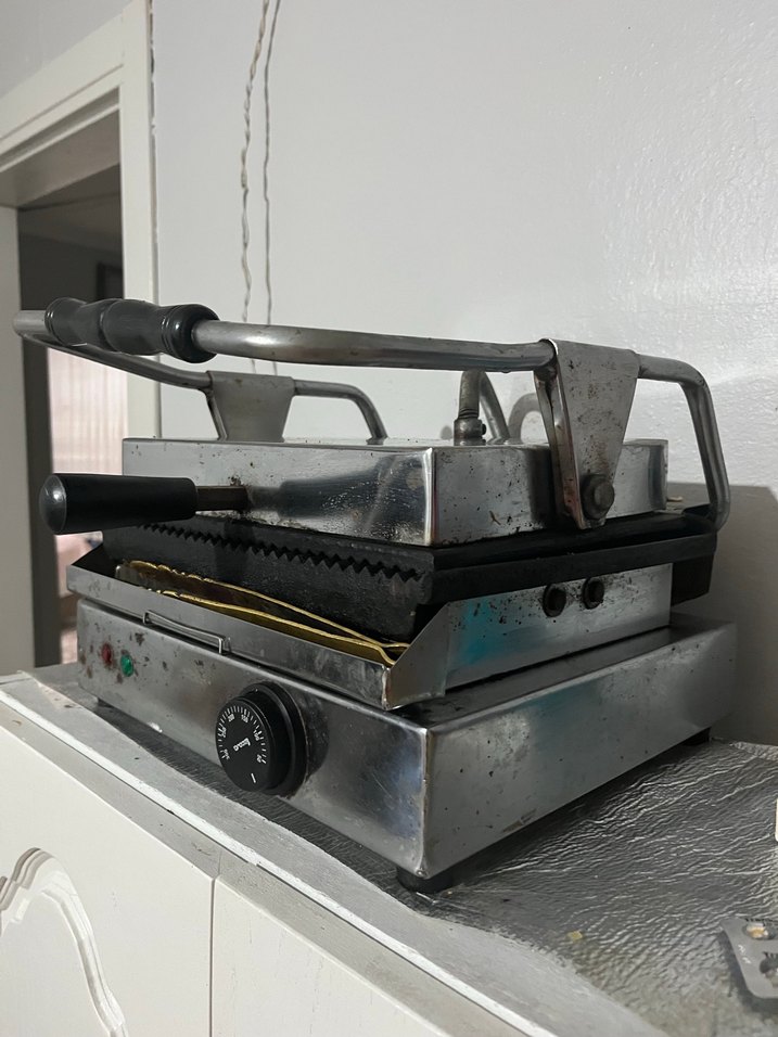 Gri renkte, sanayi tipi tost makinası incecik tost yapıyor alan pişman olmaz hiç bir arızası yoktur sıkıntısı yoktur