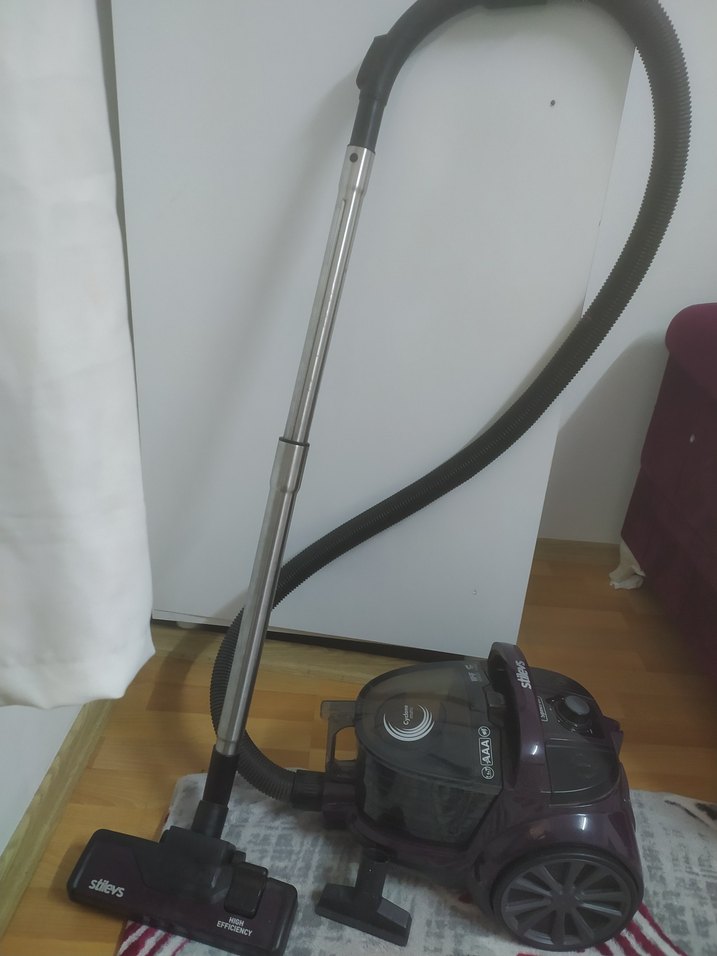 Gri renkte, torbasız elektrikli süpürge, esnek hortumu ve metal uzatma borusuyla kolay temizlik sağlar. Çoklu başlıklar içerir. hiçbir sorunu yoktur çok kullanılmadı.