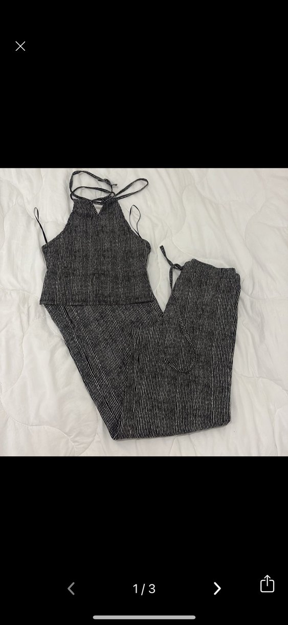 Gri triko kumaştan üretilmiş, askılı ve halter yaka kadın takım. Rahat kesimi ve uzun boyu ile dış mekan kullanımı için uygundur.