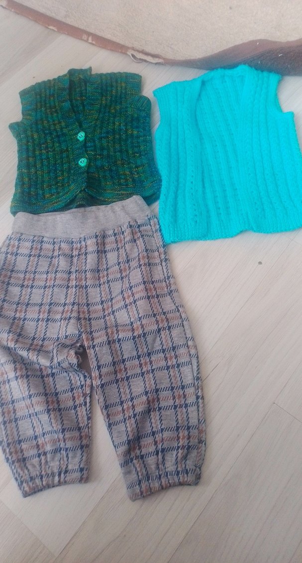 Bu bebek erkek kıyafet seti, düğmeli, bisiklet yaka kolsuz triko yelek ve yumuşak, rahat kumaştan kareli triko pantolon içerir. hepsinin fyati