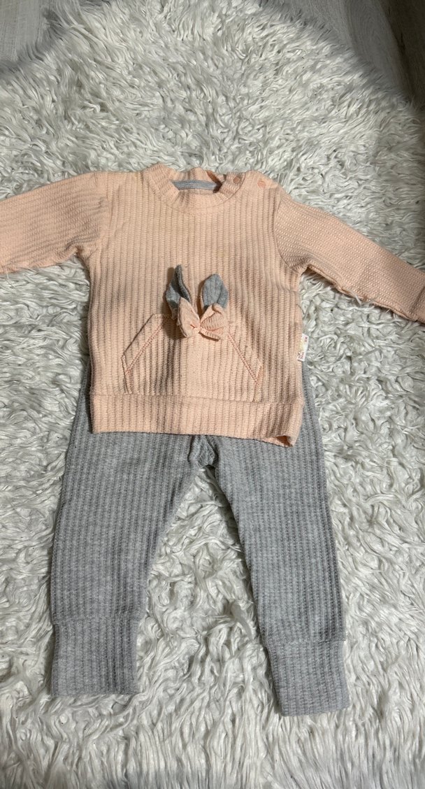 Uzun kollu, triko bebek kız takımı. Pembe üstte cep ve fiyonk detayı, gri pantolonla kombinlenmiş. Yumuşak ve rahat.