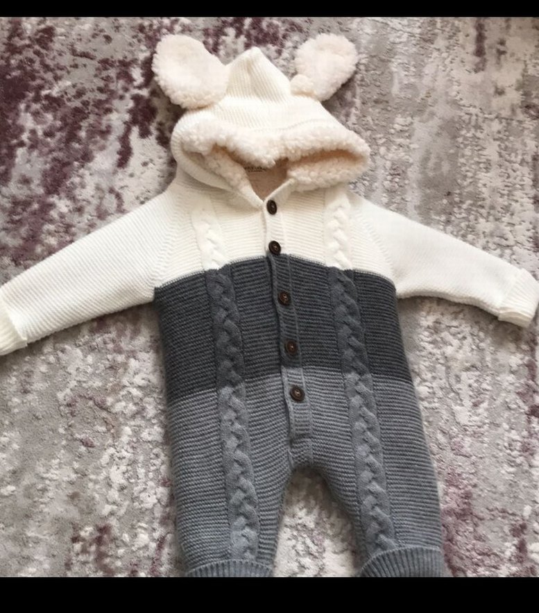Gri tonlarda, yumuşak peluş astarlı kapüşon ve kulak detaylı, konforlu ve sıcak tutan triko bebek tulumu. içi kurklu