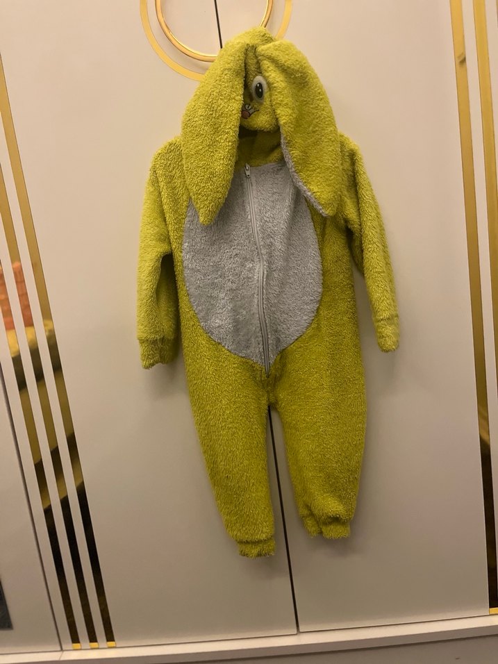 Gri renkte triko dokulu bebek tulumu, yumuşak ve sıcak kumaştan üretilmiştir. Kapüşonunda uzun kulaklar ve önden fermuar vardır.