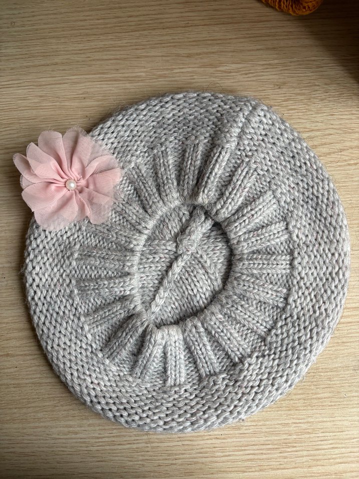 Gri renkli, triko örme yapısına sahip kadın beresi, pembe kumaş çiçek detayıyla rahat ve sade bohem tarz sunar.