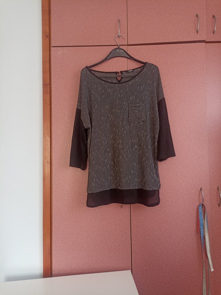 Gri renkte, triko dokulu, uzun kollu, salaş kesim bluz. Yuvarlak yakalı ve küçük cepli, günlük rahat kullanıma uygun.eni 57 cm boyu 75 cmdir