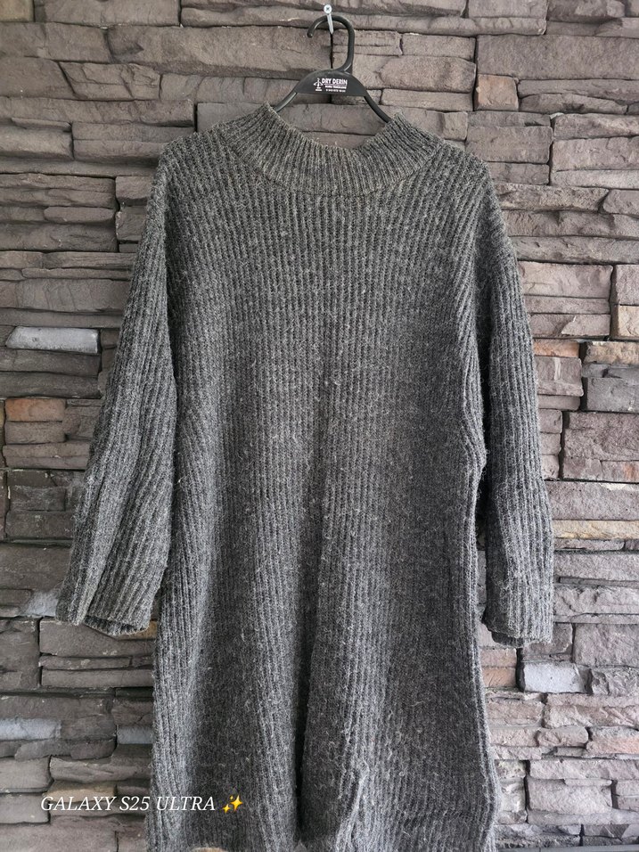 Gri renkli, boğazlı, uzun kollu ve bol kesim triko kazak. Midi boy uzunluğu tüylü yapıdadır sonradan tuylenme gibi deildir