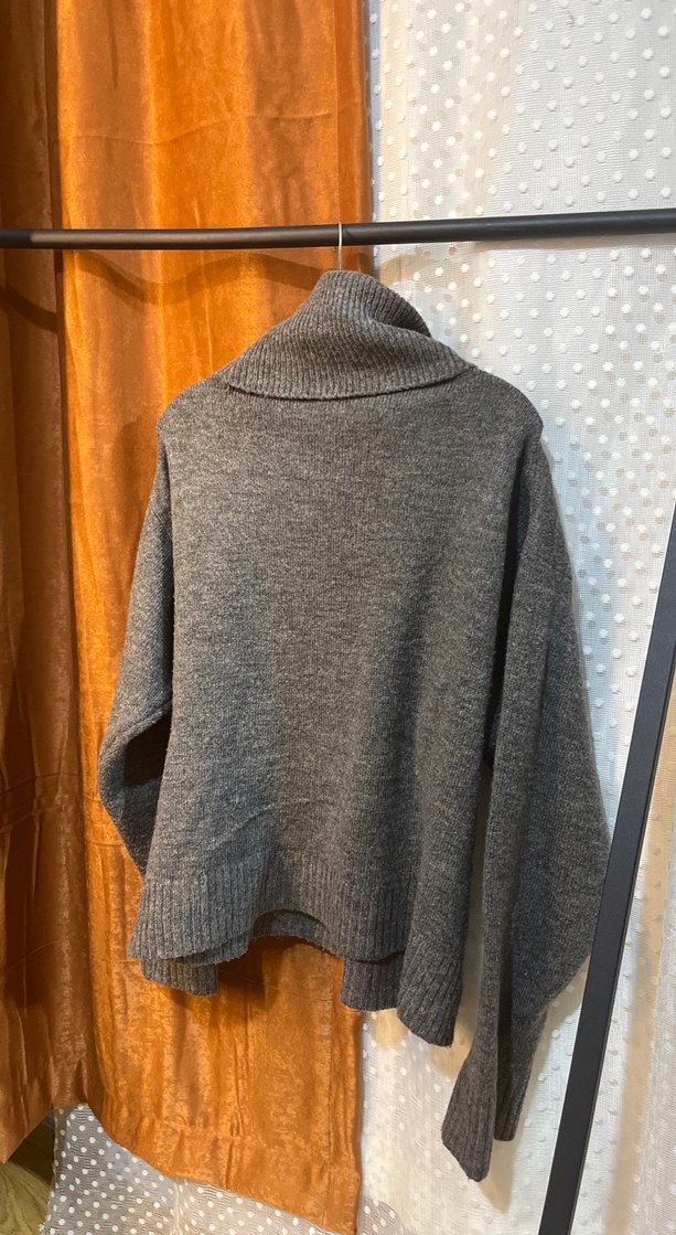 Gri renkli, yumuşak dokulu yün triko boğazlı kazak, bol kesim ve uzun kollu, rahat ve günlük kullanım için ideal.