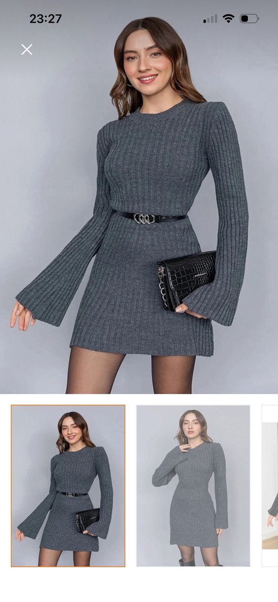 Bu fit kesim gri triko elbise, yuvarlak yakalı ve uzun, genişleyen kollu tasarımıyla rahat ve gündelik bir stil sunar. Kısa boyu ve fitilli dokusu günlük kullanım için uygundur.