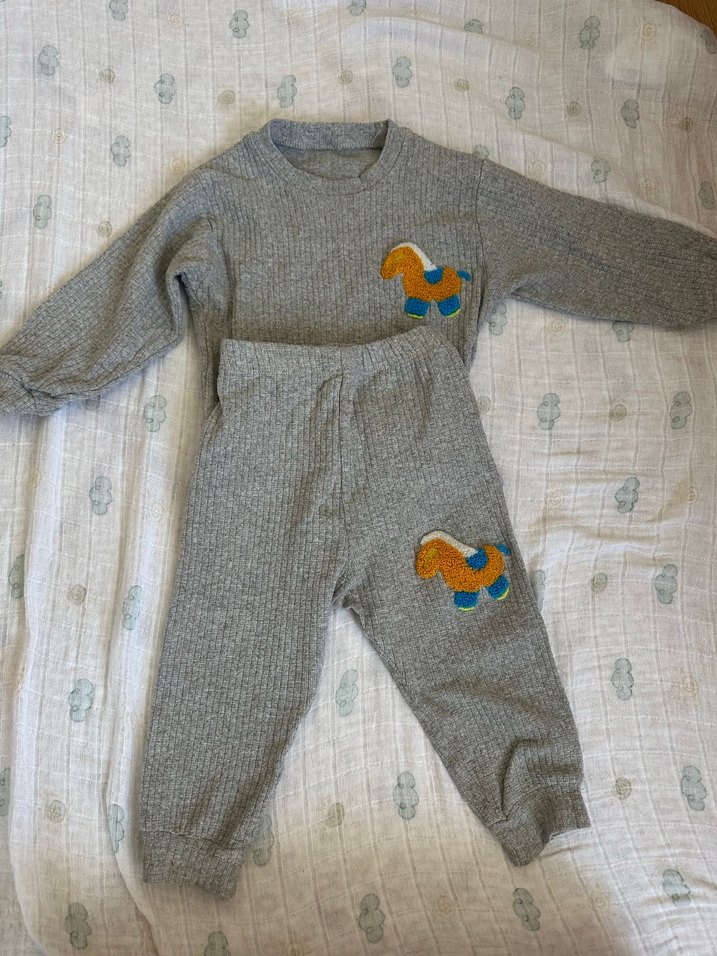 Gri renkli triko erkek bebek takımı, uzun kollu ve bisiklet yaka. Üst ve pantolonda nakışlı renkli at figürleri bulunur, yumuşak triko kumaştan yapılmıştır.