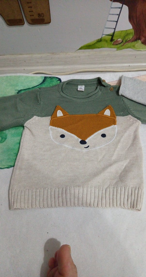 Gri renkli, triko kumaştan örülmüş, yuvarlak yaka ve uzun kollu erkek çocuk kazak. Önünde tilki desenli, rahat kesim ve yumuşak dokulu.