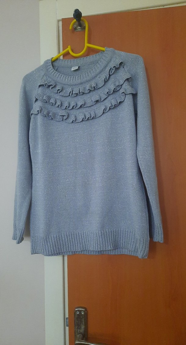 Gri triko kumaştan, yuvarlak yakalı ve uzun kollu, bol kesim kadın kazak. Göğüs kısmında fırfır detayları bulunur, rahat ve gündelik stil için uygundur.