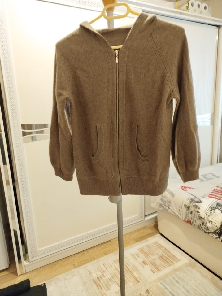 Gri renkte, yumuşak yün kumaştan örülmüş, kapüşonlu, uzun kollu, bol kesim hamile hırkası. Önde fermuar ve cepler bulunur.