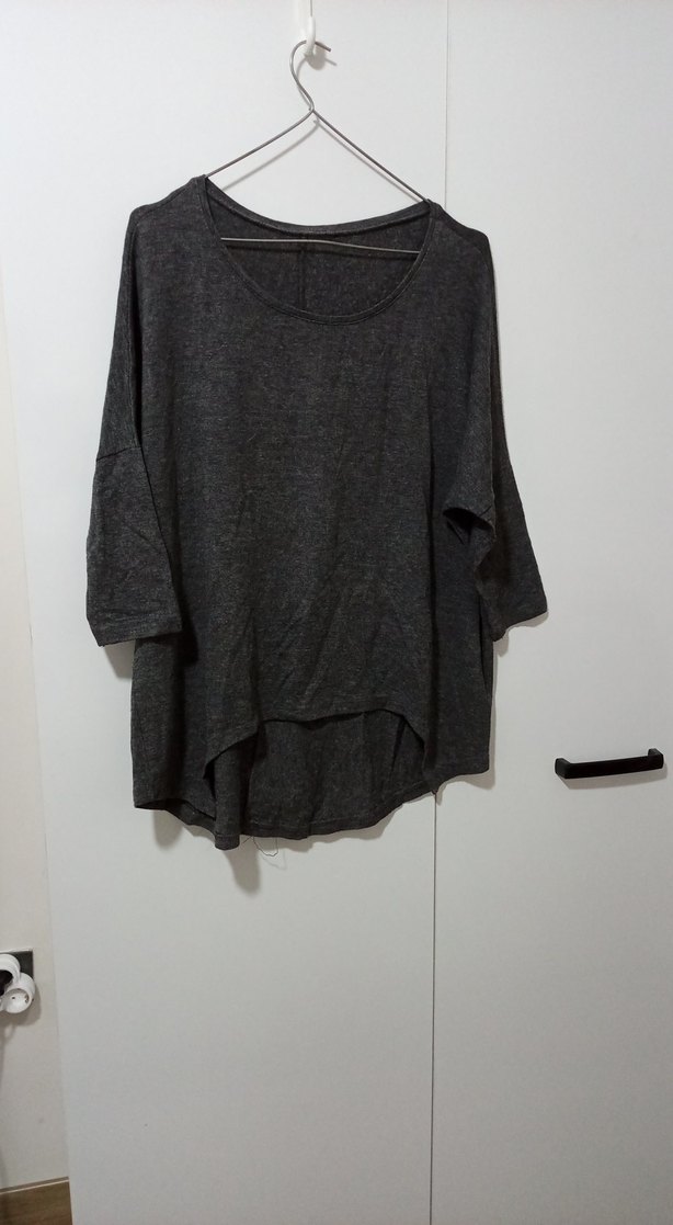 Gri triko , yuvarlak yaka ve dirsek kollu, bol kesimiyle günlük kullanıma uygun sade ve rahat bir modeldir.