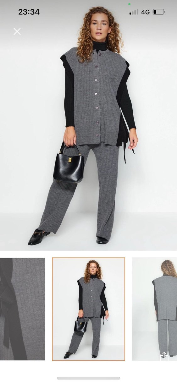 Gri midi uzunlukta, kemerli, kesik yaka ve askılı kollu deri ofis takımıdır. Günlük kullanıma uygundur.