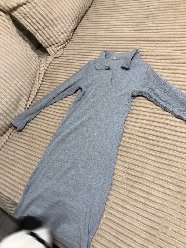 Gri renk, uzun kollu, yakalı ve triko dokulu kadın elbisesi, günlük kullanıma uygundur. s m uyumlu