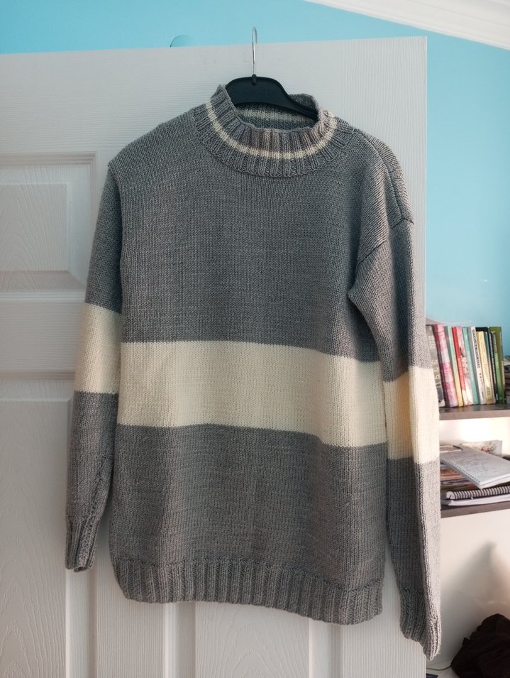 Gri renkte, yün dokuma bu kadın kazağı, yuvarlak yakalı ve uzun kolludur. Rahat kesimi ve normal boyuyla gündelik kullanıma uygundur. Beyaz yatay çizgi deseni vardır.