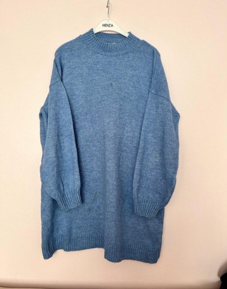 Mavi triko kumaştan, bisiklet yaka ve uzun kollu, bol kesim, normal uzunlukta kadın kazak. Desensiz, günlük rahat kullanıma uygun. HENZA markadır.