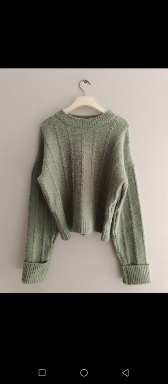 Gri renkli, yuvarlak yaka ve uzun kollu, bol kesim triko kazak. Pastel tonuyla sade ve rahat bir görünüm sunar.