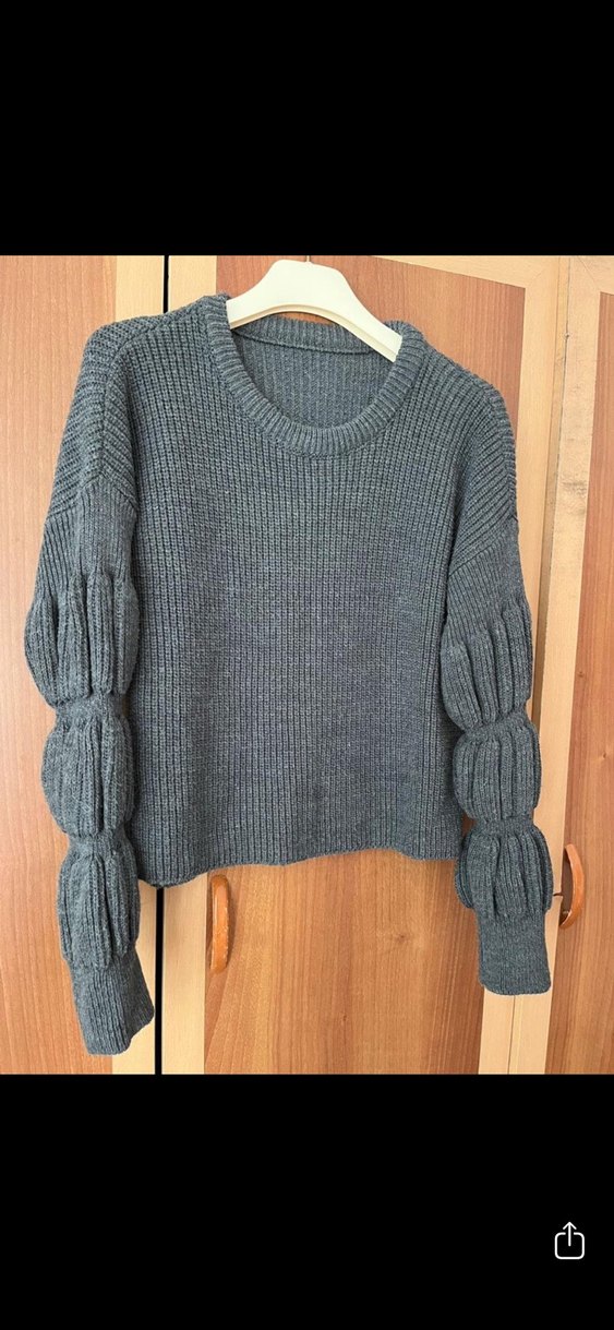 Gri renkte, yuvarlak yakalı, kabarık uzun kollu, kısa kesim ve bol kalıplı triko kadın kazak. Az kullanılmıştır 36 ve 38 bedenlere uygundur kalın ve sıcak tutar