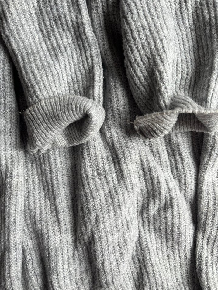 Gri keten kumaştan, örme yapıda balıkçı yaka ve uzun kollu, rahat kesime sahip günlük kullanıma uygun kadın kazak.