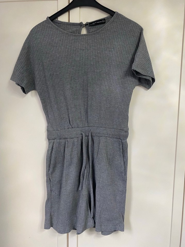 Gri triko keten kumaştan yapılmış, kısa kollu, yuvarlak yaka ve bol kesim tulum, günlük rahat sokak stili için uygundur. ✨