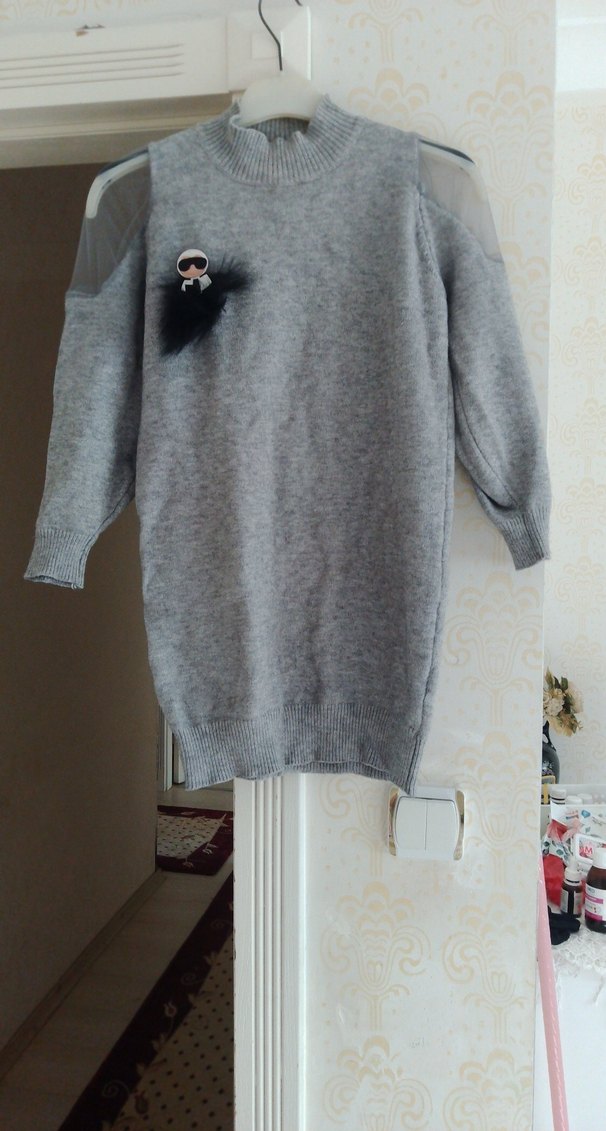 Gri renkli, triko dokulu, uzun kollu ve yuvarlak yakalı kadın midi elbise. Rahat kesimi ve nakış detaylarıyla günlük kullanıma uygundur.