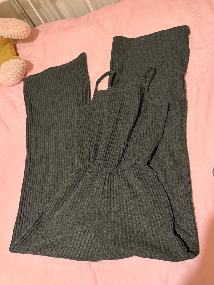 Gri renkte, triko kumaştan yapılmış, fitted kesim, boğazlı ve askılı kadın midi tulum. Günlük kullanım için uygundur.