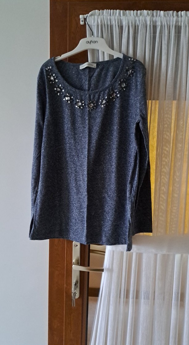 Gri renkli, penye kumaştan yapılmış, yuvarlak yakalı ve uzun kollu, boncuk detaylı kadın tişört. Rahat kesimi ve normal boyu ile gündelik kullanıma uygundur.