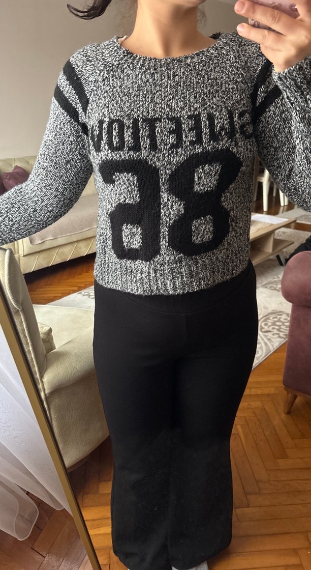 Gri renkte, uzun kollu, yuvarlak yaka, 86 baskılı, bol kesim triko kadın sweatshirt.