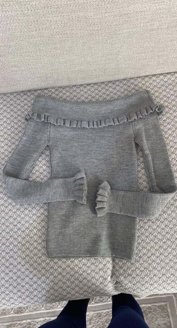 Gri renkte, triko kumaştan, uzun kollu ve kayık yaka, fitted kesim kadın bluz. Kollarında ve yaka kısmında fırfır detaylı, günlük rahat kullanım için uygun. Omuzları düşük