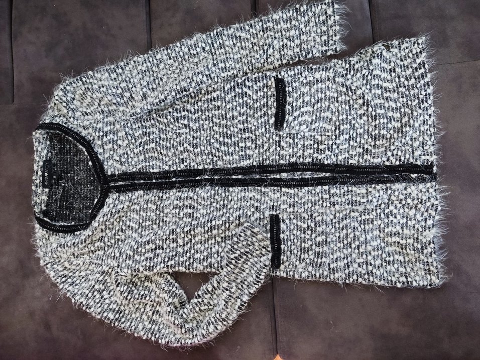 Gri renkli, triko dokulu uzun kollu kadın ceket. Fitted kesimi, notched lapel yaka ve uzun boyuyla günlük rahat kullanıma uygundur. Hollanda'dan ithal edilmiş, gümüş rengi parıltılı, çok şık ve sıcak, diz üstü yün bir ceket. Hiç giymedim; artık ihtiyacım olmadığı için satıyorum. Ceketin kapanmasını sağlayan metal bir tokası ve iki küçük cebi var.