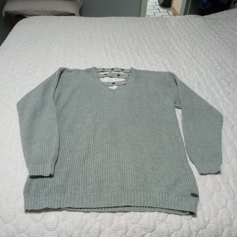 Gri triko, yuvarlak yakalı ve uzun kollu, rahat günlük kullanım için bol kesim ve normal uzunlukta kazak.