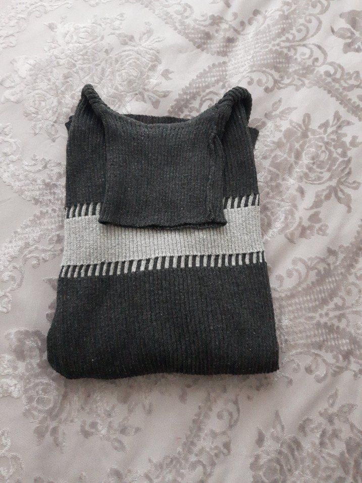 Gri örgü kumaştan, tek renk ve uzun kollu, salaş kesimli, tek parça çizgi detaylı kadın triko kazak. Rahat ve günlük kullanıma uygun.