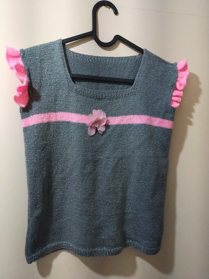 Kolsuz, gri triko yelek, yuvarlak yaka ve bol kesim. Omuzlarda pembe fırfırlar ve göğüste küçük çiçek detaylıdır.