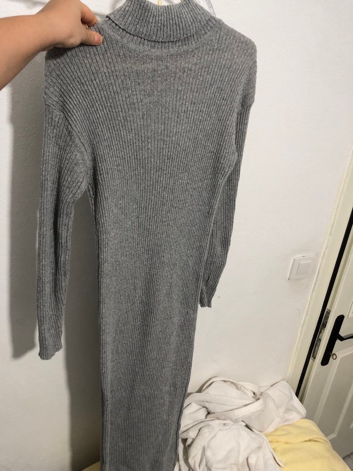 Gri triko midi boy boğazlı elbise, uzun kollu ve vücuda oturan kesime sahiptir. Rahat ve desensiz tasarımıyla günlük kullanıma uygundur.