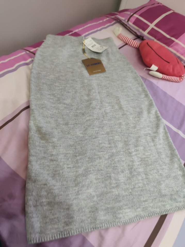 Yumuşak pamuktan yapılmış gri triko etek, bol ve rahat kesime sahip midi boyda, günlük kullanım için uygundur.