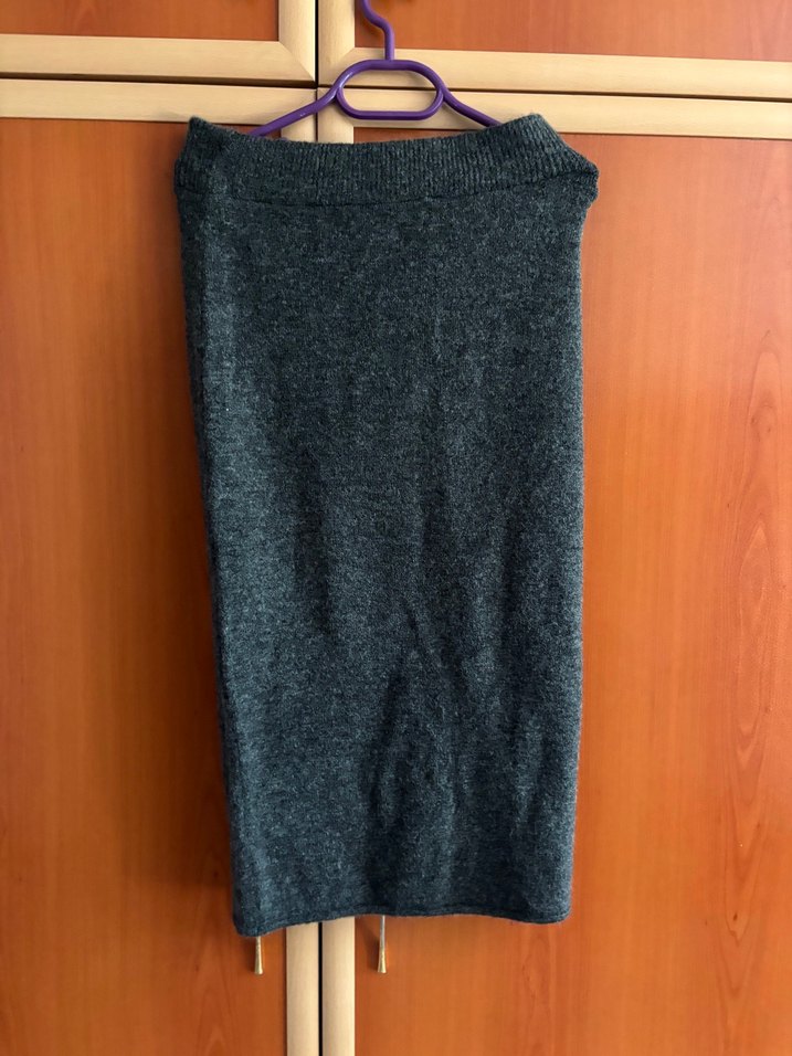 Yumuşak yün triko kumaştan yapılmış, gri renkli, normal boy ve dar kesim midi hamile eteği.
