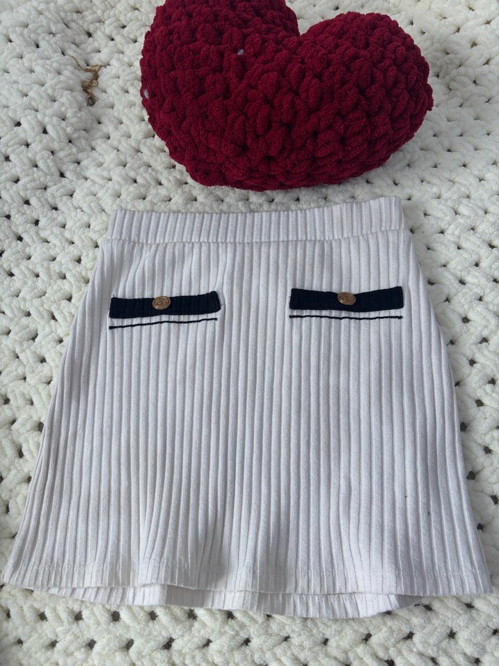 Fit kesim, gri triko mini etek, fitilli dokusu ve düğme detaylı ceplerle günlük sokak stiline uygun.