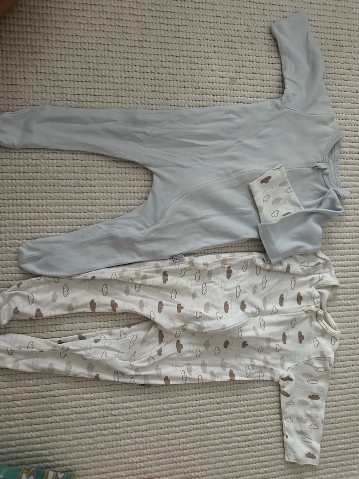 Yumuşak pamuktan yapılmış, biri düz gri diğeri bulut desenli iki uzun kollu bebek tulumu. Her ikisi de rahatlık için triko örme. 3 ay