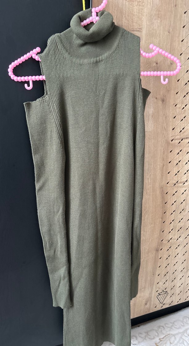 Gri renkte, boğazlı ve kolsuz uzun triko elbise. Yumuşak sentetik kumaştan, günlük rahat kullanıma uygun.