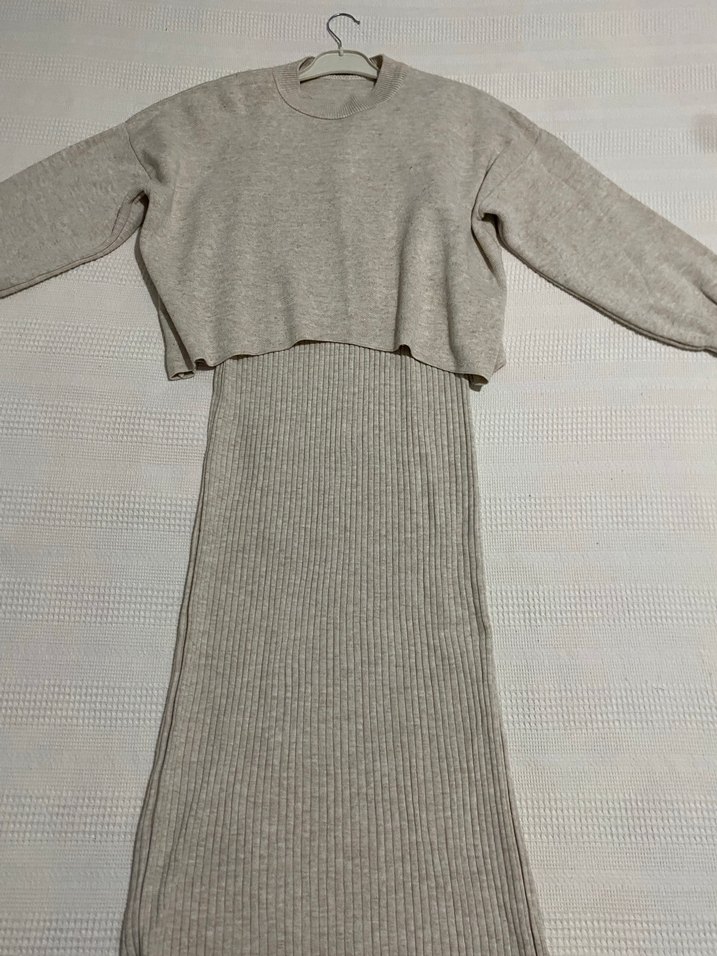 Gri renkte, uzun ve vücuda oturan triko elbise, yuvarlak yaka ve uzun kolludur. Rahat ve günlük kullanıma uygundur.