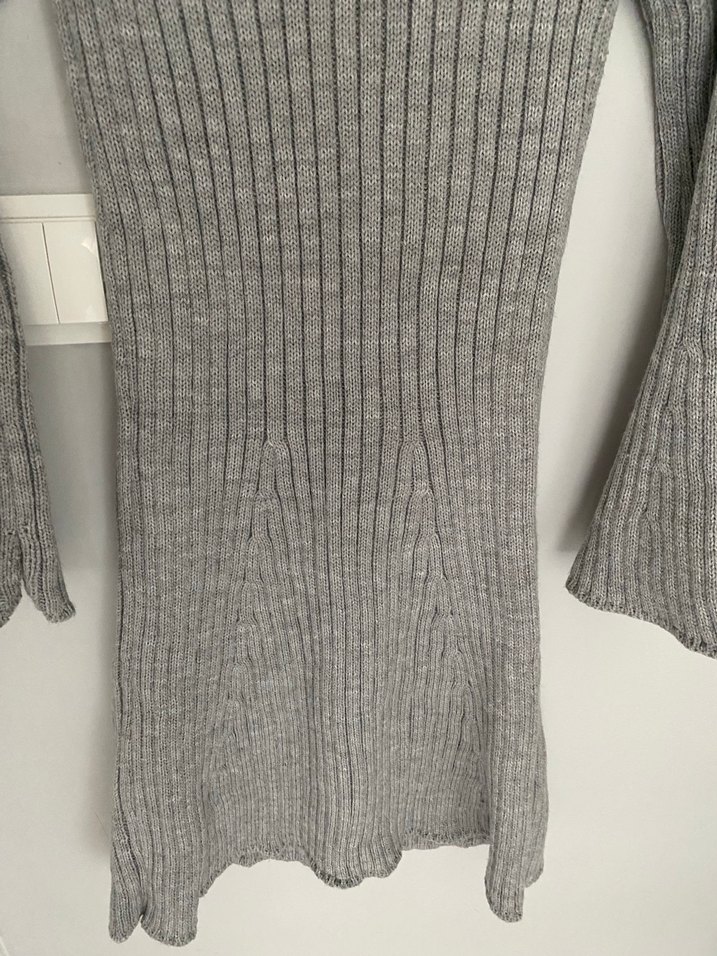 Uzun kollu, fit kesim gri triko elbise. Midi boy ve rahat dokulu, normcore tarzına uygun.